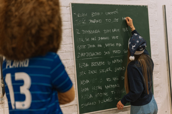 Posebno zanimljiv dio radionice bila je izrada navijačke pjesme Dinama, u kojoj su učenici, zajedno s voditeljem, osmislili stihove posvećene svom omiljenom klubu. Kreativna energija ispunila je školsku dvoranu, a mali autori s ponosom su predstavili svoje „plave“ stihove.