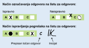Kod ovakvih zadataka prvo ćete zaokružiti odgovor koji želite u ispitnoj knjižici. U ispitnoj knjižici možete slobodno križati i ispravljati odgovore, u njoj nije bitno kako su odgovori zapisani. Međutim, na kraju ispita te ćete odgovore morati prepisati na poseban list za odgovore – tu prijepis treba biti čim uredniji i s čim manje grešaka, a ako do pogrešaka i dođe, postoji poseban način kako se one ispravljaju. U nastavku možete vidjeti način kako se odgovori bilježe i po potrebi ispravljaju na listu za odgovore.